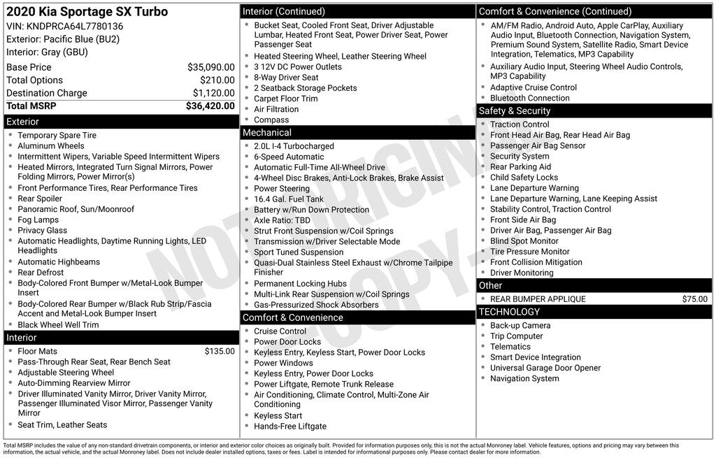 2020 Kia Sportage SX 2.0L I4 DGI Turbocharged 6-Speed Automatic Electronic with Overdrive AWD 4D Sport Utility Pacific Blue 19/24 City/Highway MPG AWD, 19" Alloy Wheels, 4-Wheel Disc Brakes, 8 Speakers, ABS brakes, Air Conditioning, Alloy wheels, AM/FM radio: SiriusXM, Apple CarPlay & Android Auto, Auto High-beam Headlights, Auto-dimming Rear-View mirror, Automatic temperature control, Axle Ratio: TBD, Brake assist, Bumpers: body-color, Carpet Floor Mats, Compass, Delay-off headlights, Driver door bin, Driver vanity mirror, Dual front impact airbags, Dual front side impact airbags, Electronic Stability Control, Emergency communication system: UVO link, Exterior Parking Camera Rear, Four wheel independent suspension, Front anti-roll bar, Front Bucket Seats, Front Center Armrest, Front dual zone A/C, Front fog lights, Front reading lights, Fully automatic headlights, Garage door transmitter: HomeLink, Heated & Ventilated Front Bucket Seats, Heated door mirrors, Heated front seats, Heated steering wheel, Illuminated entry, Leather Seat Trim, Leather Shift Knob, Leather steering wheel, Low tire pressure warning, Navigation System, Occupant sensing airbag, Outside temperature display, Overhead airbag, Overhead console, Panic alarm, Passenger door bin, Passenger vanity mirror, Power door mirrors, Power driver seat, Power Liftgate, Power moonroof, Power passenger seat, Power steering, Power windows, Radio: AM/FM/MP3 Premium Audio System, Rear anti-roll bar, Rear Bumper Applique, Rear seat center armrest, Rear window defroster, Rear window wiper, Remote keyless entry, Roof rack: rails only, Security system, Speed control, Speed-sensing steering, Split folding rear seat, Spoiler, Sport steering wheel, Steering wheel mounted audio controls, Tachometer, Telescoping steering wheel, Tilt steering wheel, Traction control, Trip computer, Turn signal indicator mirrors, Variably intermittent wipers, Ventilated front seats, AWD.